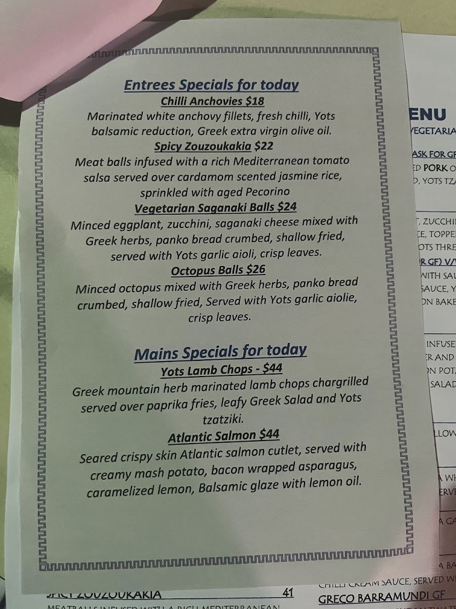 Yots is celebrated for its freshly prepared dishes, with standout items including the trio of dips, savory yiros, and succulent lamb.